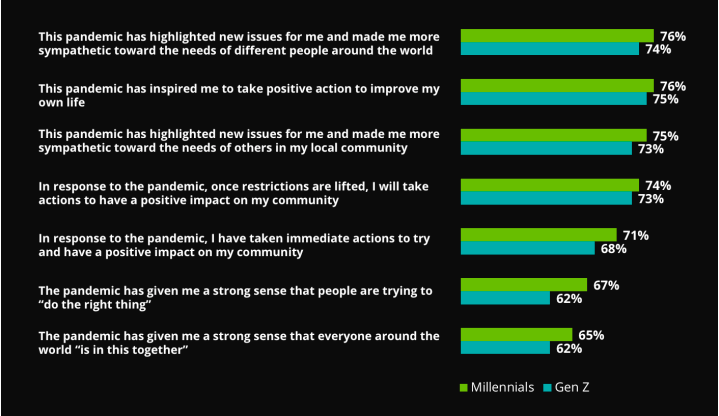 No mínimo, a pandemia impulsionou a vontade de construir um mundo em que as pessoas, a sustentabilidade, a inclusão devem ser a prioridade de empresas e governos. Millennials e Z são gerações comprometidas em agir com estes valores em mente.